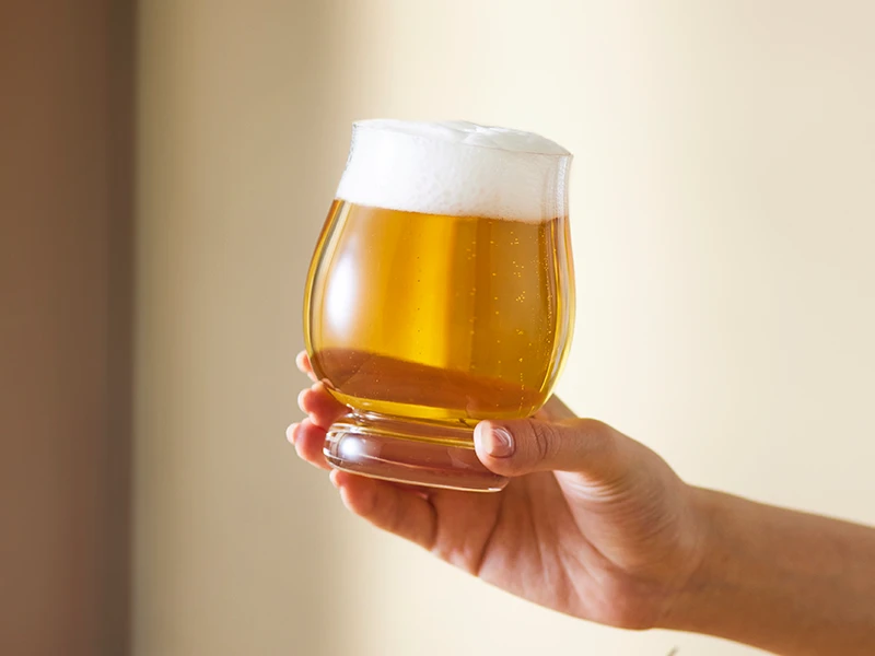 ころんとした丸みを帯びたフォルムに手が自然と沿い、重心も低めに設計されているので手の中にすっと収まる安定感があるグラスです。