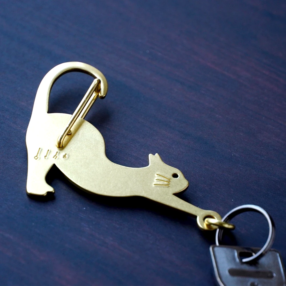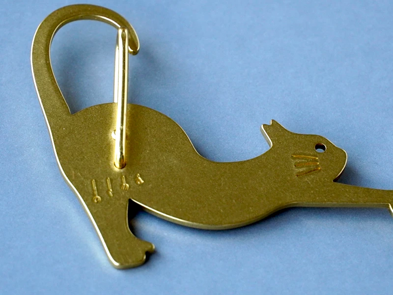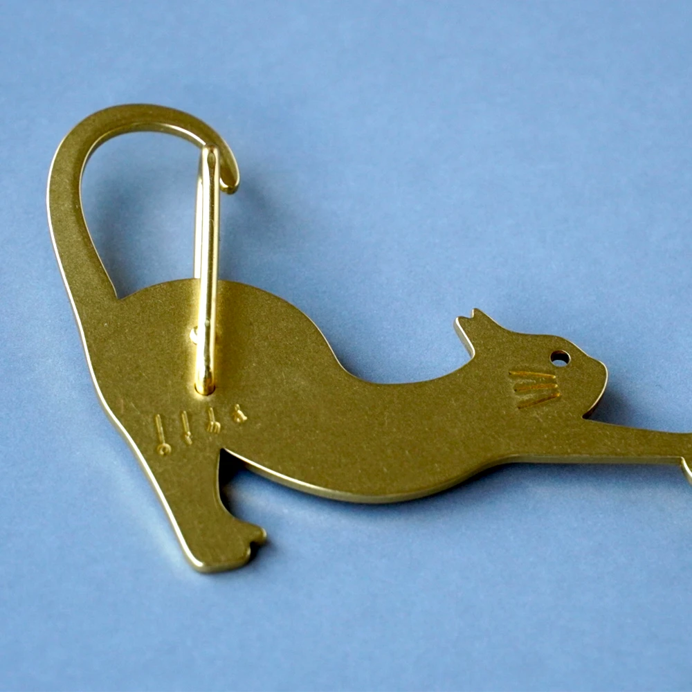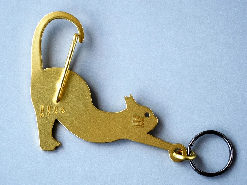 しなやかに伸びをしているネコをモチーフにした、真鍮製のカラビナ。