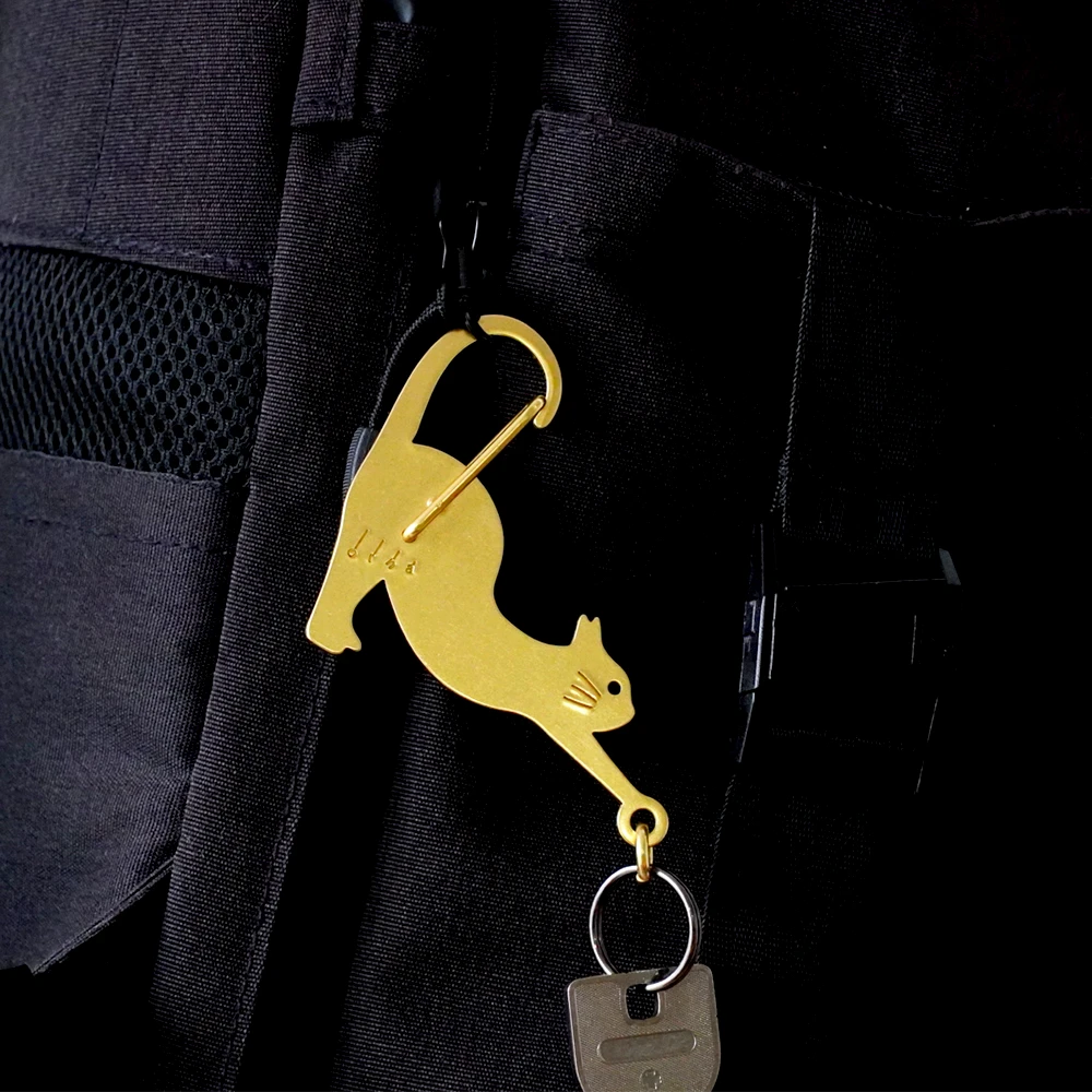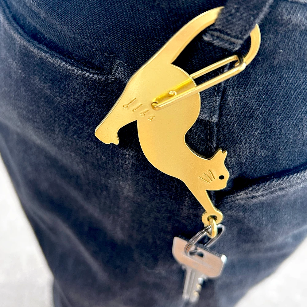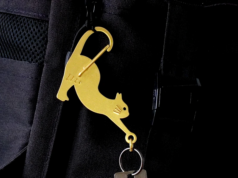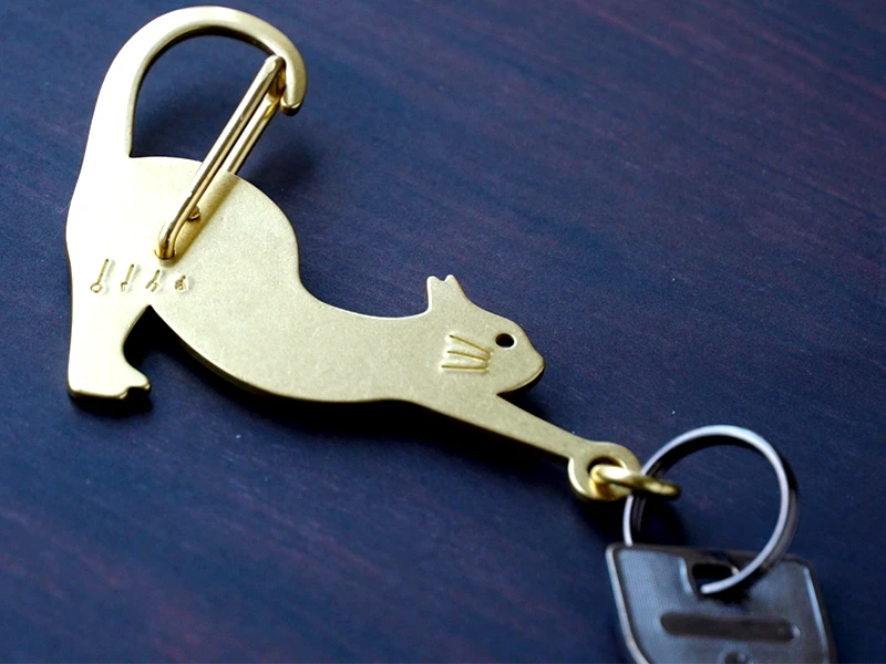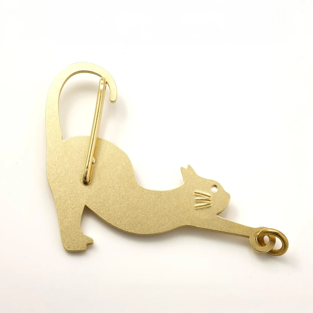しなやかに伸びをしているネコをモチーフにした、真鍮製のカラビナ。